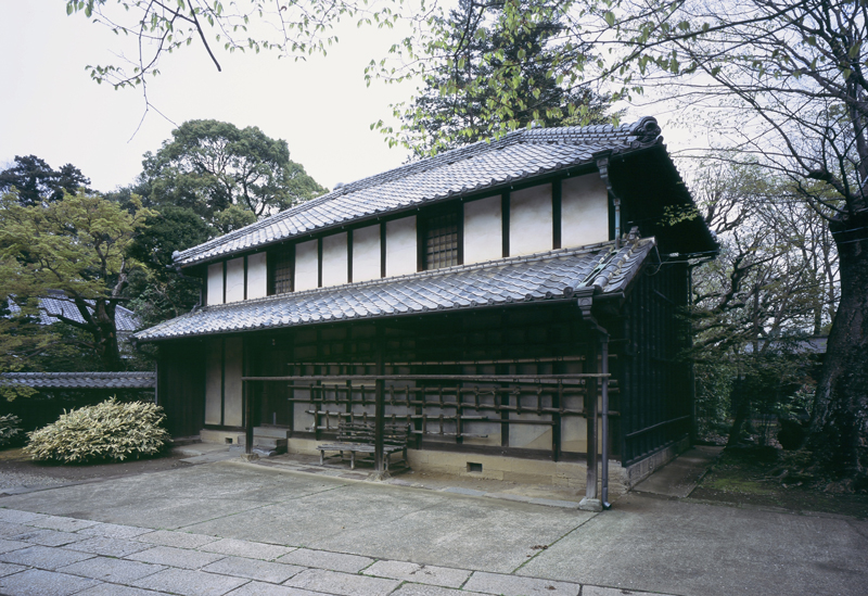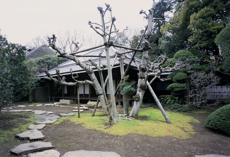 東側には枯山水の庭と背後に竹林を望む新座敷庭園があり、明治期の銅版画にも描かれているサワラとスギの大木が残っています。