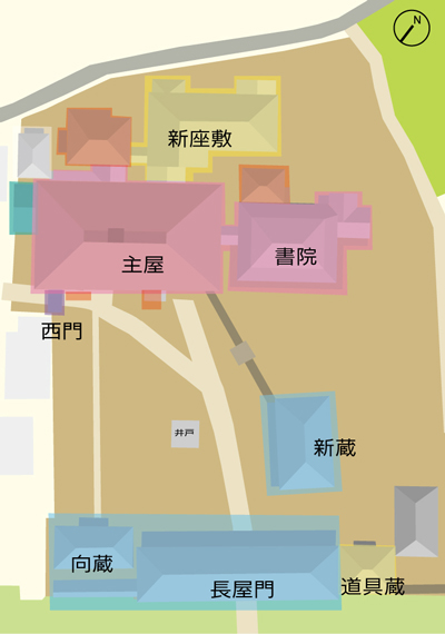 比較的簡素な造りですが、外観は長屋門や東西塀とともに、一体感を構成する重要な要素となっています。