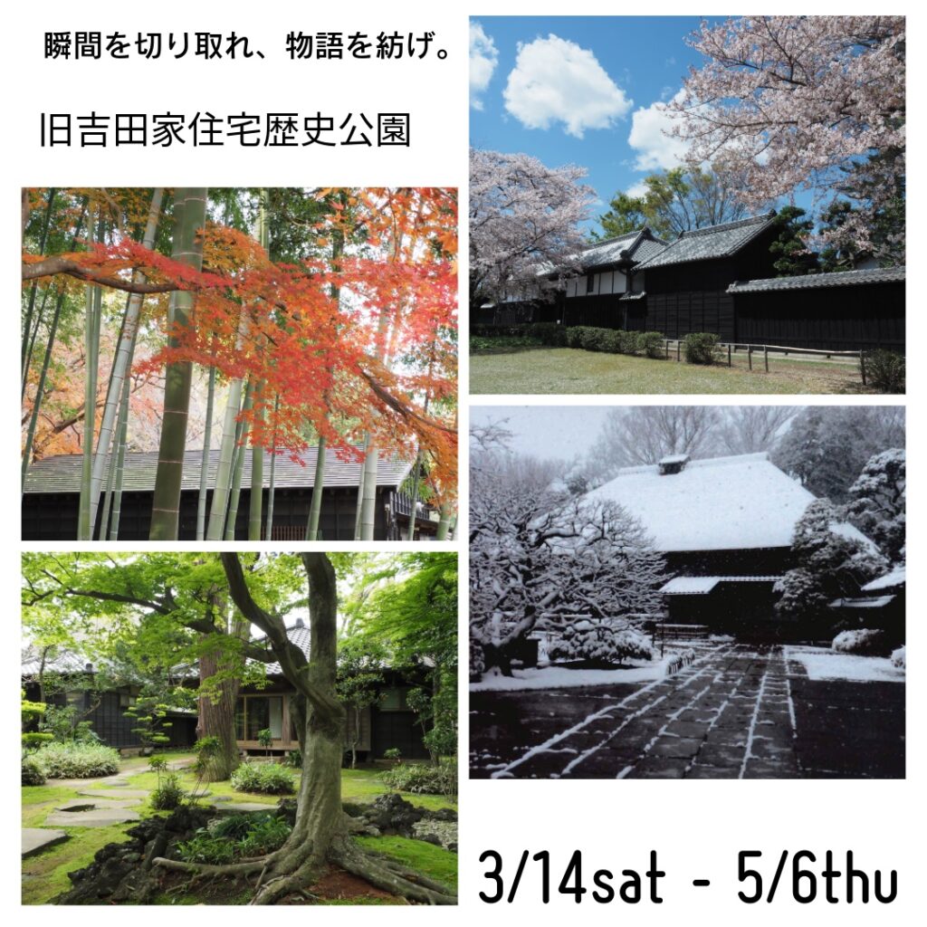 開催日: 2026年2月20日 旧吉田家住宅歴史公園内の春をはじめとする、四季折々の写真などを概ね40点展示いたします。 会 期:令和8年3月14日(土)〜5月6日(木) 時 間:9時30分〜16時30分 ※最終日は14時まで 場 所:新蔵ギャラリー 写真協力:柏写楽会、猪又かじ子 会 URLをコピーしました! URLをコピーしました! お花見おはなし会を開催します。 和菓子付きプチコーヒー抽出教室 Sakura Week 関連記事 竹灯籠ライトアップ Sakura Week サクラweek「春の写真展」 箏と尺八の夕べ Sakura Week 癒しの夜桜コンサート Sakura Week 竹灯籠づくり Sakura Week 津軽三味線 五錦竜二コンサート Sakura Week オリジナルのキーホルダーや缶バッチを作ろう Sakura Week 和菓子付きプチコーヒー抽出教室 Sakura Week