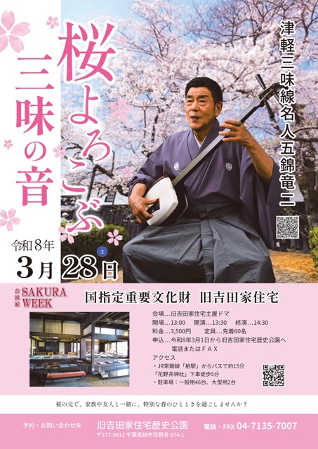 開催日: 2026年3月28日 柏市在住の津軽三味線名人五錦竜二による「桜よろこぶ三味の音」コンサートです。 開催日:3月28日(土) 開 演:13時30分 終 演:14時30分 定 員:先着60名 参加費:3500円 申込み:3月1日(日)午前9時30分から電話又はFAX URLをコピーしました! URLをコピーしました! オリジナルのキーホルダーや缶バッチを作ろう Sakura Week 竹灯籠づくり Sakura Week 関連記事 竹灯籠ライトアップ Sakura Week 竹灯籠づくり Sakura Week サクラweek「春の写真展」 箏と尺八の夕べ Sakura Week 癒しの夜桜コンサート Sakura Week 竹灯籠づくり Sakura Week オリジナルのキーホルダーや缶バッチを作ろう Sakura Week 和菓子付きプチコーヒー抽出教室 Sakura Week