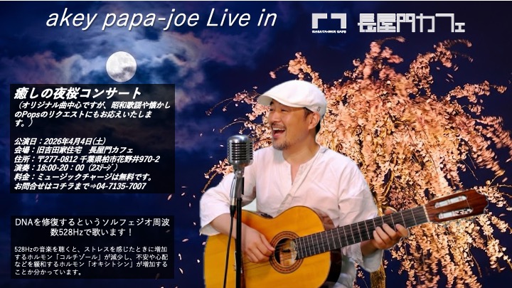 吉田ミュージックでおなじみのスウイングビートチームひろしのメンバーのakey papa-joeさんのソロコンサートです。オリジナルや昭和歌謡や懐かしのPoPsのリクエストにもお応えいたします。